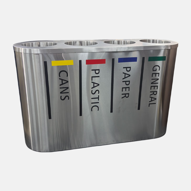 This unit features four clearly labeled compartments designed to streamline waste separation for paper, plastic, metal, glass, and general refuse. The intelligent layout reduces contamination in recycling streams and makes proper disposal intuitive for the public, directly supporting sustainability targets in commercial and municipal settings.