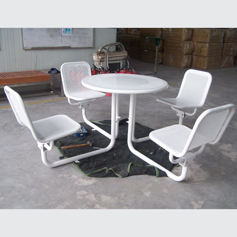 The centerpiece is a sturdy perforated metal outdoor table with a φ800mm round top, crafted from 2.5-3.0mm steel plate. Supported by a robust φ60mm welded pipe frame, it is finished with a high-grade DuPont outdoor powder coating. This treatment provides the essential protection that defines true weather-resistant patio furniture, guarding against rust, UV damage, and moisture to ensure a long service life.