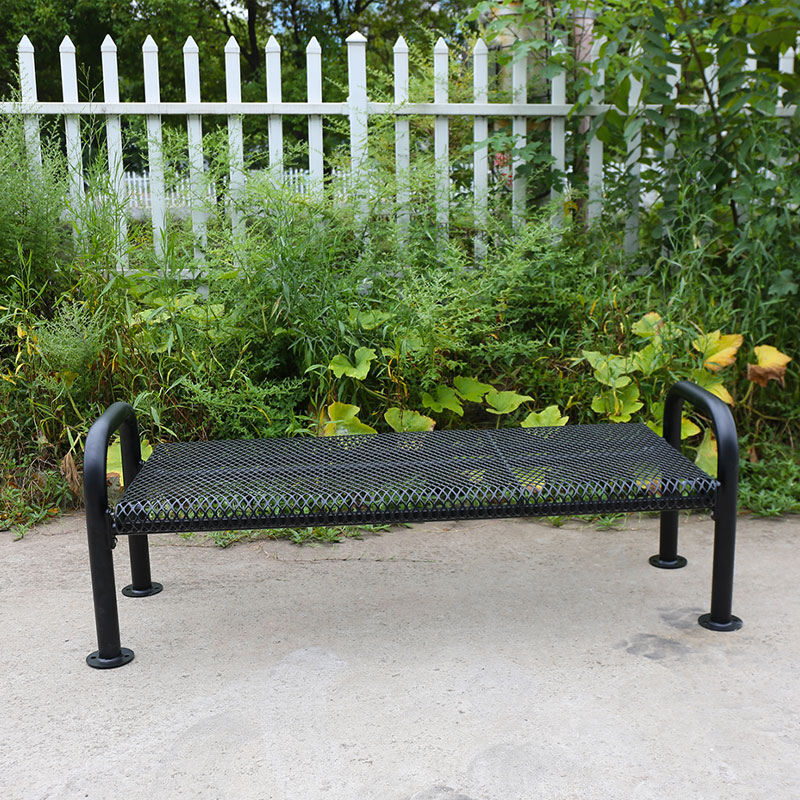 It uses a galvanized steel mesh seat, a thermoplastic or Plasticsol coating, and a heavy-duty cast iron frame for maximum outdoor durability.